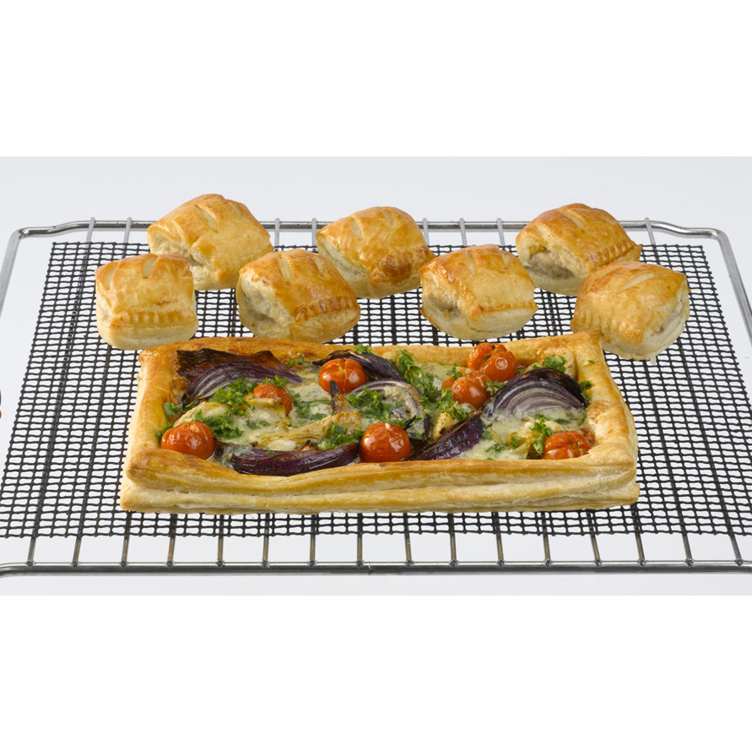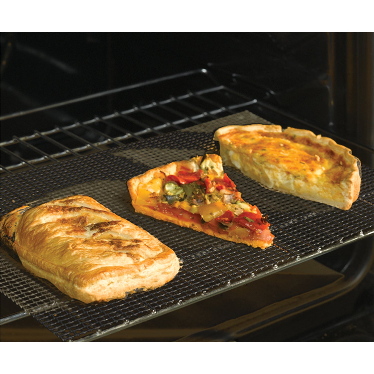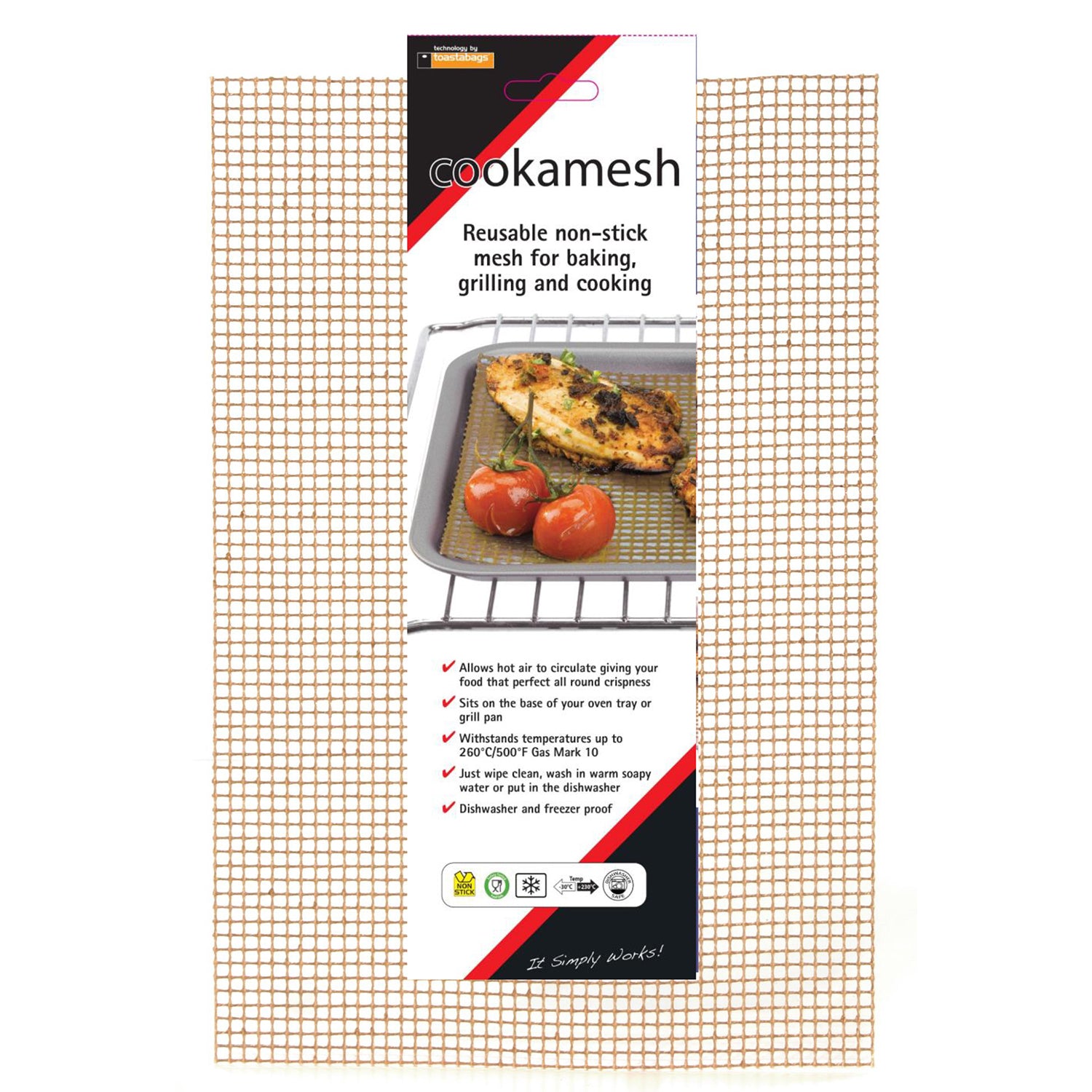 Cookamesh are mesh sheets that sit directly on your oven shelf or in an oven tray and are designed to allows air to circulate for all round even cooking. Ideal for all types of food, including breaded chicken and fish, quiches, garlic bread and much more.