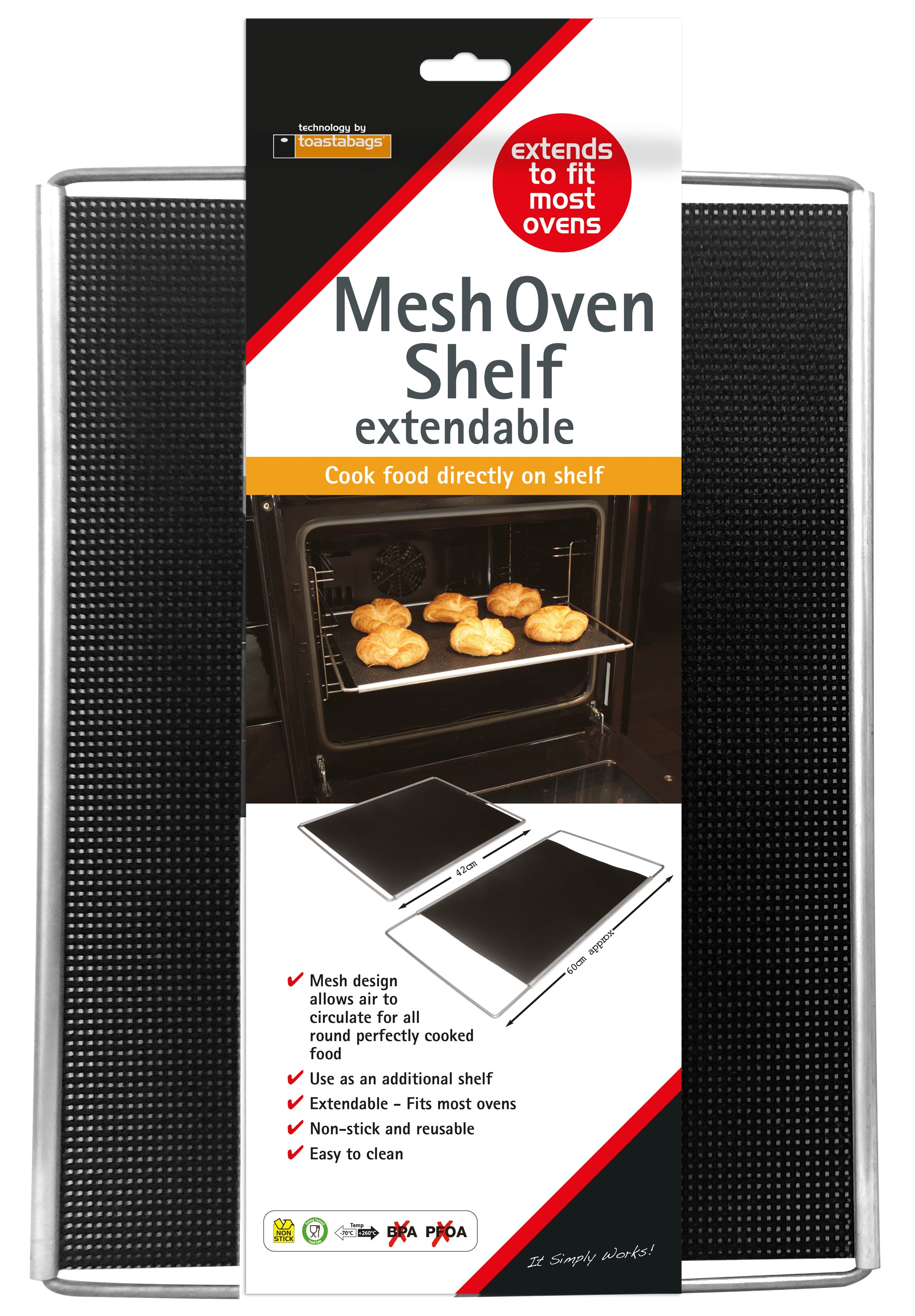 Use as an extra shelf in your oven and cook food directly on it, no need for baking trays or tins. The shelf is extendable, the sides pull out meaning that it can fit most ovens, from 42cm to 60cm approx. wide.